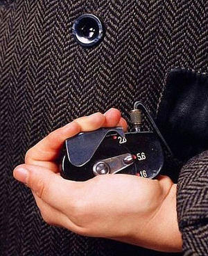 A camera hidden inside of a coat jacket, controlled by a hand held mechanism.