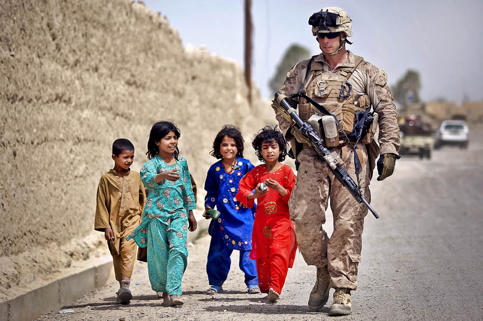 Afghan children who hope to receive candy from U.S. Marine Corps Lance Cpl. Jacob Kartchner follow him as he patrols with fellow Marines and Afghan police outside the Hazar Joft Bazaar in the Garmsir district of Afghanistan's Helmand province, April 8, 2012. Kartchner is a team leader assigned to Kilo Company, 3rd Battalion, 3rd Marine Regiment. The Marines partnered with Afghan police to maintain security in and around the bazaar, which is one of the area's busiest commercial centers. U.S. Marine Corps photo by Cpl. Reece Lodder.