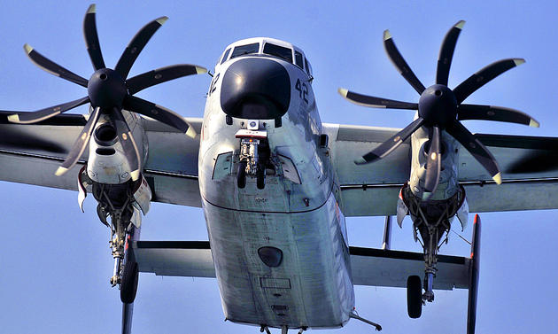 A C-2A Greyhound aircraft prepares to land on the flight deck of the aircraft carrier USS Carl Vinson in the Arabian Sea, Jan. 12, 2012. U.S. Navy photo by Seaman George M. Bell.