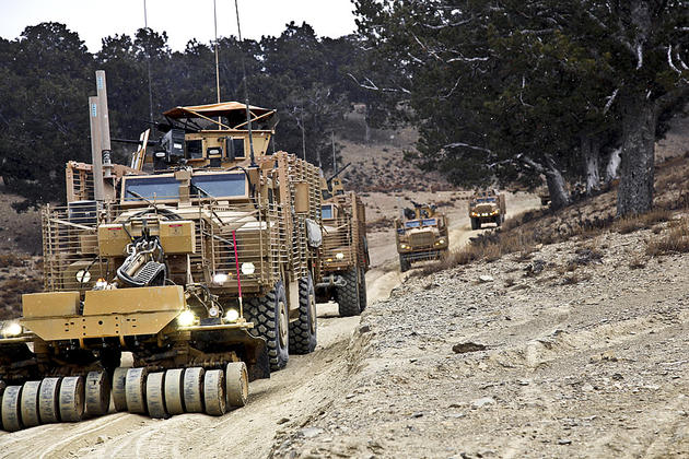 A convoy of U.S. Army mine-resistant, ambush-protected vehicles prepare to move out in the Mangrah Troy district of Afghanistan's Paktika province, Jan. 4, 2012. U.S. Army photo by Spc. David Barnes.