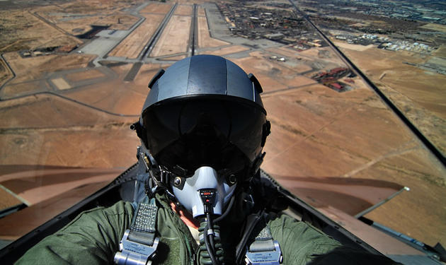 U.S. Air Force Airman 1st Class Matthew Bruch, an aerial photographer with 1st Combat Camera Squadron, takes a self portrait during a flight in an F-15D from the 65th Aggressor Squadron flying in support of the Air Force Weapons School over Nellis Air Force Base, Nev., May 17, 2012. The Air Force Weapons School is a five-and-a-half-month training course which provides selected officers with the most advanced training in weapons and tactics employment. Throughout the course, students receive an average of 400 hours of post graduate-level academics and participate in demanding combat training missions. Photo by Airman 1st Class Matthew Bruch.