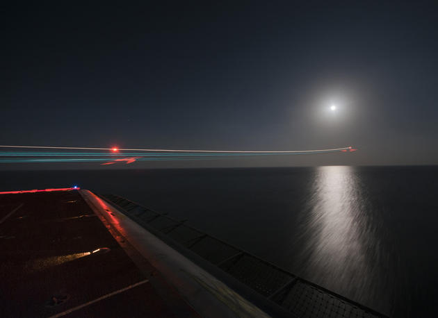 An F/A-18F Super Hornet recovers aboard the aircraft carrier USS Carl Vinson in the Indian Ocean, April 11, 2012. The Carl Vinson and Carrier Air Wing 17 are participating in the Malabar Exercise with ships and aircraft from the Indian navy. The Hornet is assigned to Strike Fighter Squadron 22. U.S. Navy photo by Petty Officer 2nd Class James Evans.