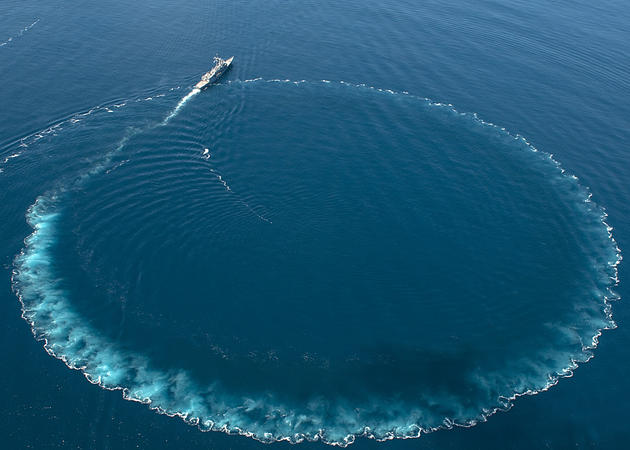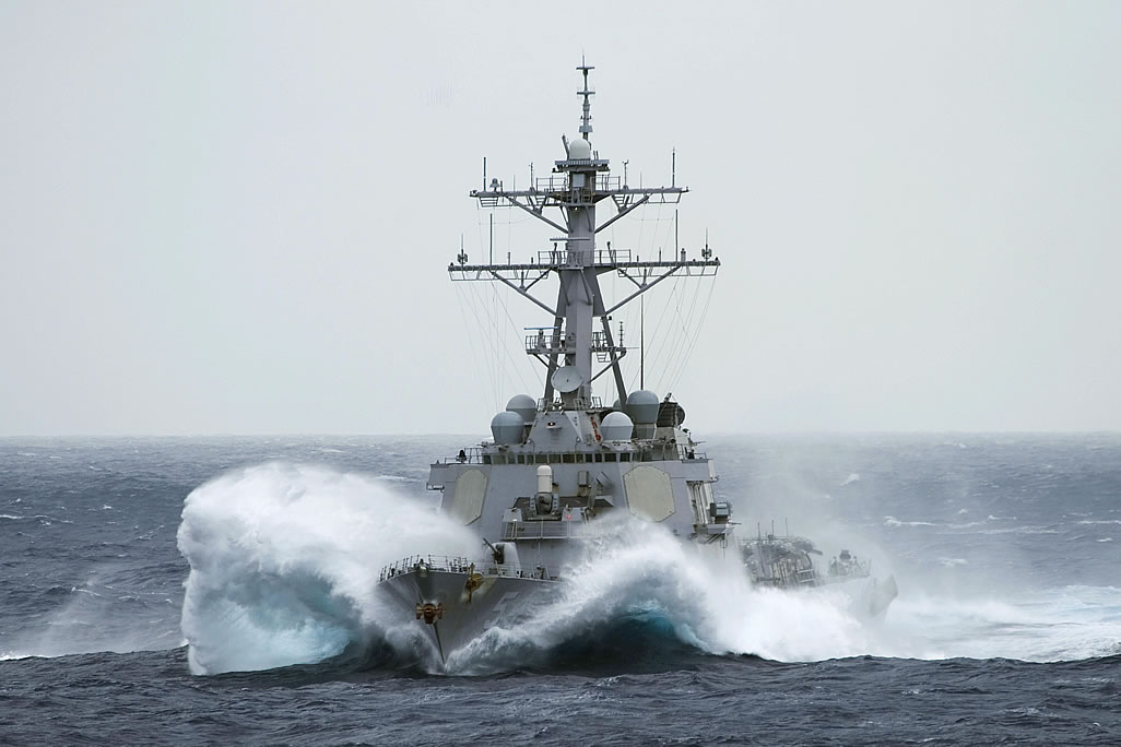 The guided-missile destroyer USS Curtis Wilbur transits through rough seas in the Pacific Ocean. Curtis Wilbur is part of Destroyer Squadron 15 and is underway with the George Washington Carrier Strike Group helping to ensure security and stability in the western Pacific Ocean. Photo by Seaman Adam K. Thomas.