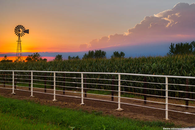 Sun with storm nearby sets over a cornfield in eastern Nebraska.