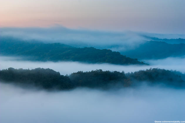 Fog settles in the valleys of the Loess Hills of western Iowa.