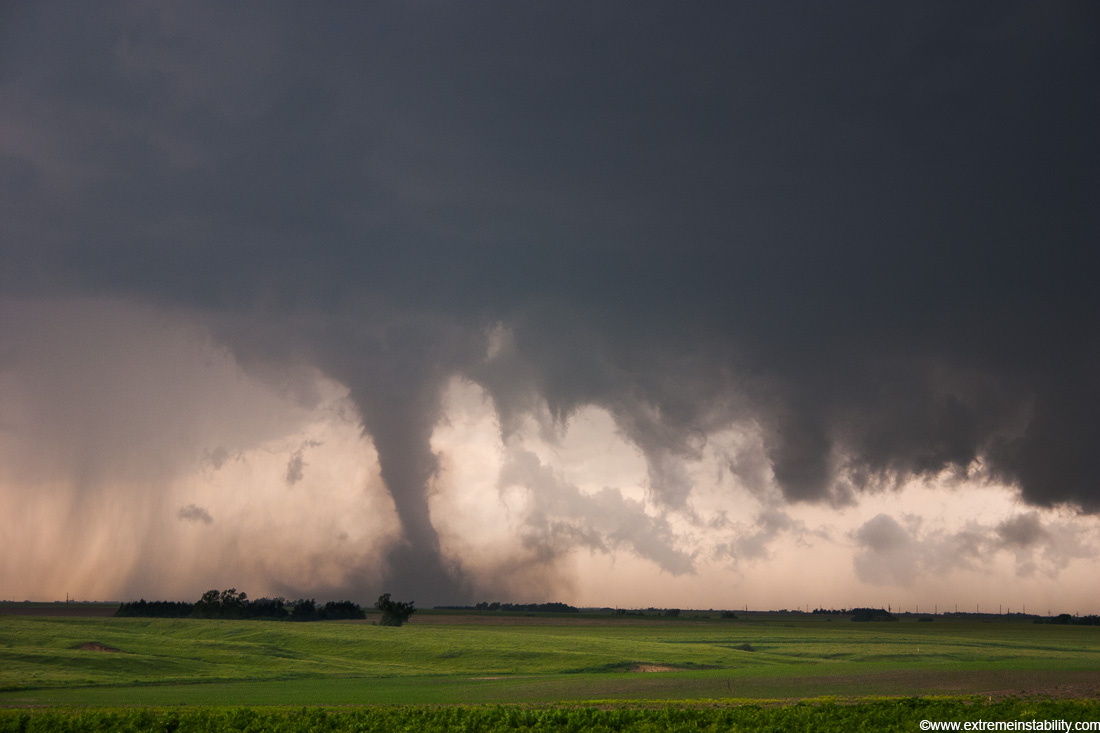 One of many tornadoes to form under a long-lived supercell on the Kansas Nebraska border, May 24, 2004. This supercell produced upwards of 15 tornadoes in just a few hours. It frequently had more than one tornado on the ground at the same time.