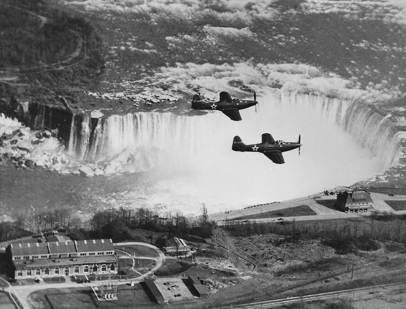 Two lend-lease Bell P-63 “Kingcobra” aircraft flying over the Niagara falls. Note the Soviet stars on the fuselage of the airplanes. These planes are most likely being moved to be shipped off to join the fight in the European theater against the Nazi war machine. 1943.