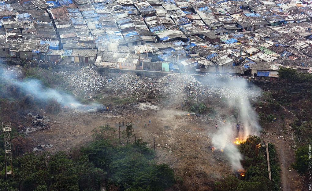 On one end you ca witness India's infamous slums. Pictured above, people burning garbage.