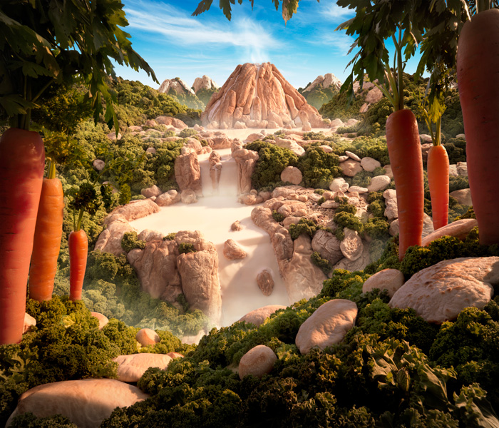 Photographer and artist Carl Warner creates these beautiful foodscapes using many different ingredients such as vegetables, fruit, dairy and meats. At a first glance, you don't realize it but everything in every image is some type of food!