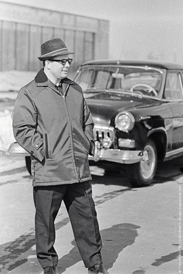A gift from the French automotive manufacturer Marta. Gagarin standing next to his Matra Djet. 1965.
