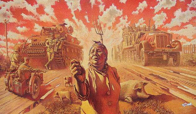 Valery portrays the smallest of details. A trained eye will notice that at this exact moment a fast-traveling Mercedes Benz is coming to a sudden stop: the front of the vehicle is slightly lowered, while the German officer's head is slightly raised in attempt to oversee the road ahead due to the long (and tall) front end of the car.