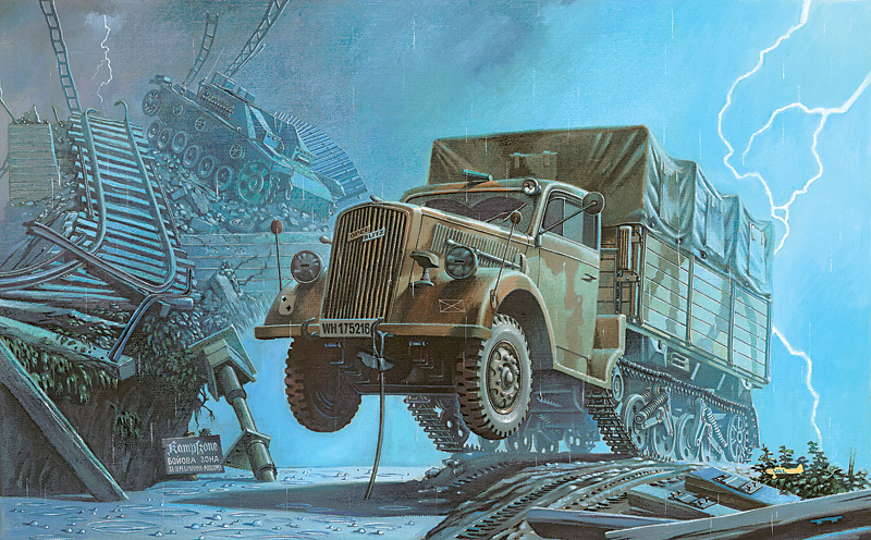 At times Valery exaggerates in order to convey his ideas and feelings. In this example, Opel literally flies through the war zone of WWII Ukraine, depicting the speed and just how much beating these trucks could take.