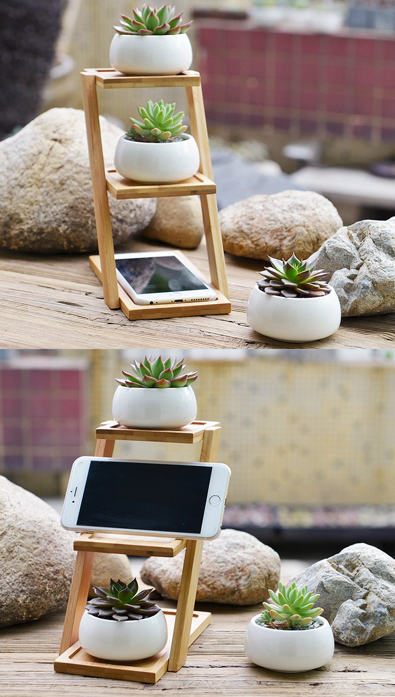 This tiered bamboo planter stand also doubles as a phone/tablet holder. Check it out