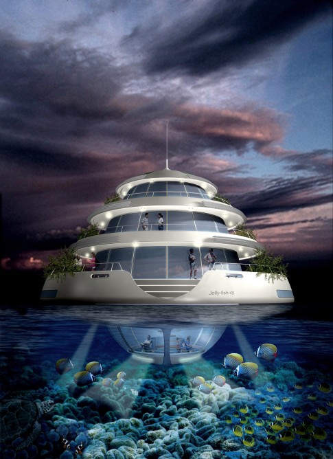 This stunning concept is designed by an Italian architecture firm named GZDG. It features a fully floating structure (with semi submerged sections) and is planned to be build on top of a protected marine area on the coast of Qatar.