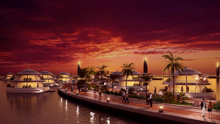 This resort features residential buildings, hotels, offices, leisure areas, floating walkways and underwater galleries. Each hotel consists of 75 luxury suites that feature a private terrace.
