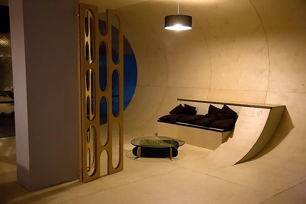 This home is actually 753 square foot skatepark. Everything inside of it is fully skate-able (tables, couches etc).