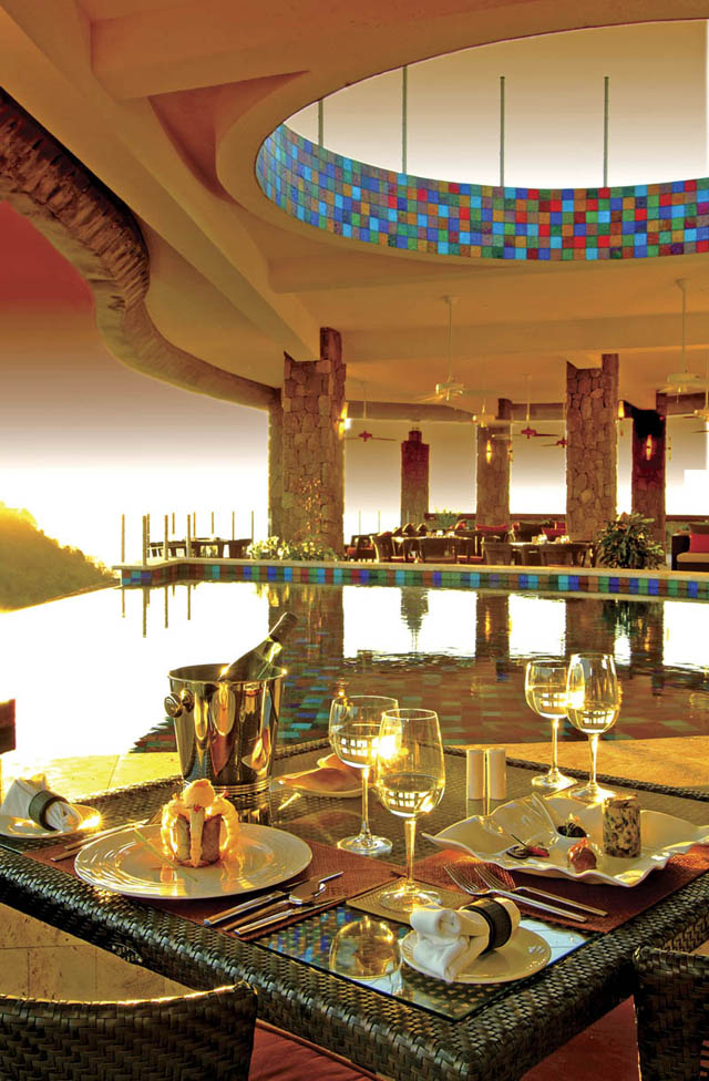 Wrapped around an infinity pool with a dazzling kaleidoscope of colors, the Jade Mountain Club caters exclusively to resident guests, celebrating James Beard Award winner, Chef Allen Susser’s “Jade Cuisine.” Hovering in space above the Jade Mountain Club is the Celestial Terrace, perfect for sunset cocktails or star-gazing.