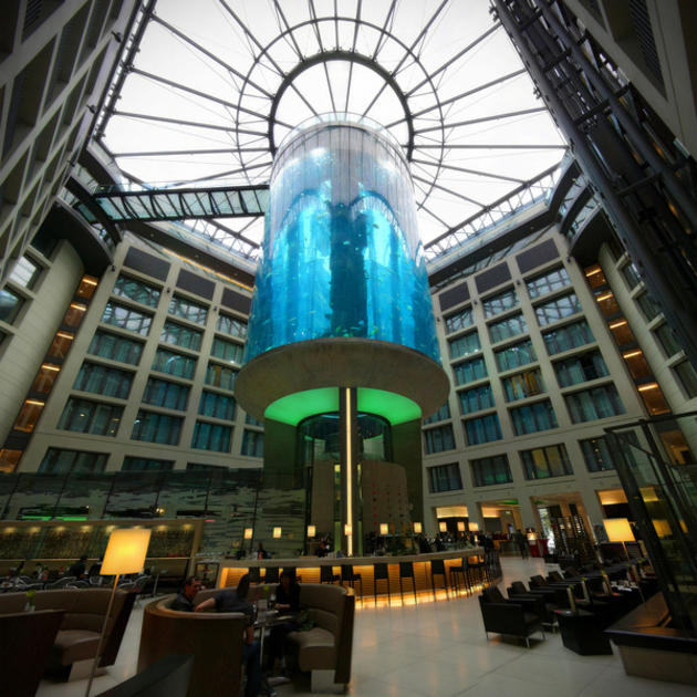 This amazing fish tank is located in Berlin, Germany inside of a hotel/office building complex. It is 25 meters tall and is built out of acrylic glass. It has a see-through elevator inside of the cylinder and cost about 12.8 million euros.