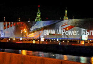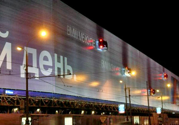 This is the biggest ad in Russia. It’s square size is more than 1.5 acres! (6000 m2). It is located in the center of Moscow city and has a few full size cars attached to it, with tail lights and headlights that go on in the evening.