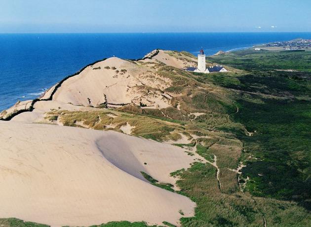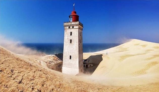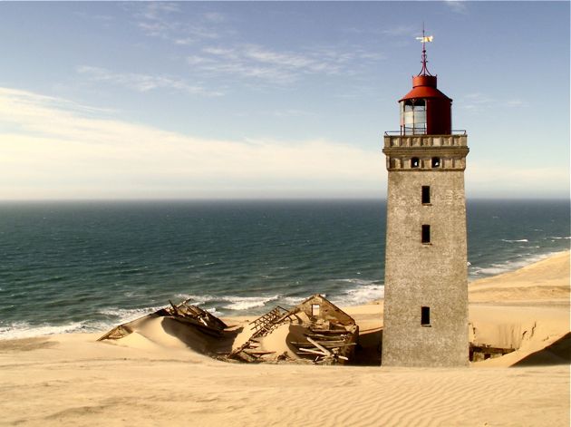 The Rubjerg Knude lighthouse was first lit on December 27, 1900. Today it rests abandoned on top of the 200 foot (60 m) cliff on the coast of the North Sea, in northern Denmark. Each year the coast erodes approximately 4.9 feet (1.5 m).