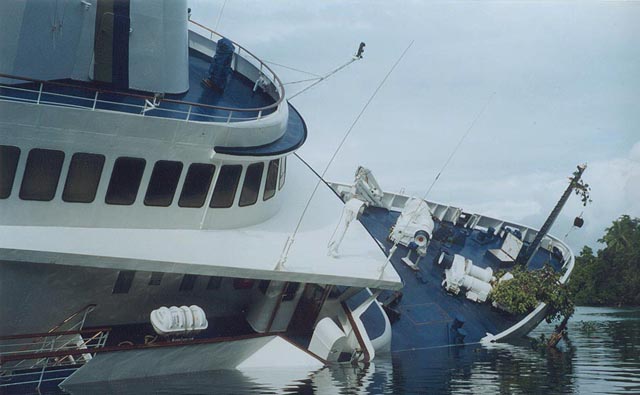 This half-sunken sea-liner is named the World Discoverer. It met its fate on April 30th, 2000, when it hit an uncharted reef in the Solomon Islands. Now it has become a popular tourist attraction and is visible from space on Google Maps.