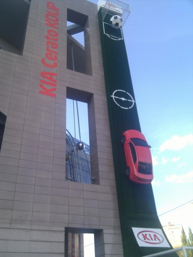 An unusual ad of Kia Cerato. The car slowly moves up and down beating the ball into the goal.