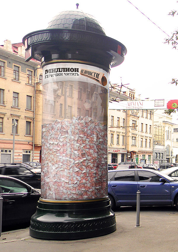 Business newspaper "Vedomosti" ("Gazette") launched an advertising campaign called a "Million reasons to read Vedomosti". Dozens of money boxes appeared on the streets of Moscow, in its business centers and malls.