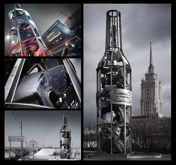 Wrecked cars inside of a metal frame shaped like a bottle, in a fight against drunk drivers.