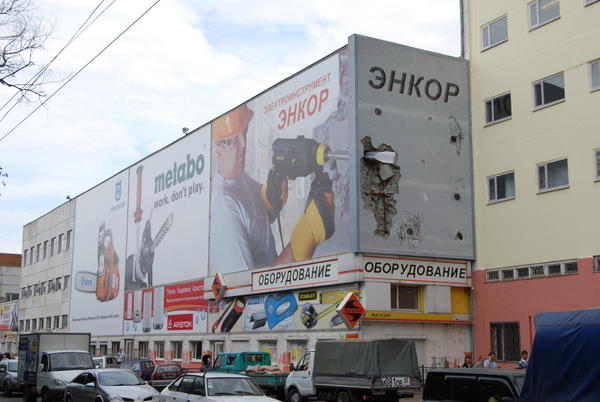 And this billboard performs 2 functions at once. It advertises the tools of the company and makes a not very beautiful wall look as a part of the billboard.