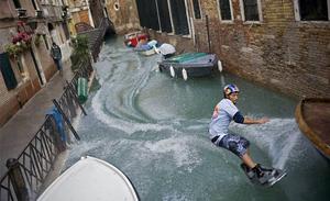 Awesome! Nothing like wake-boarding through a narrow street in Venice, Italy.